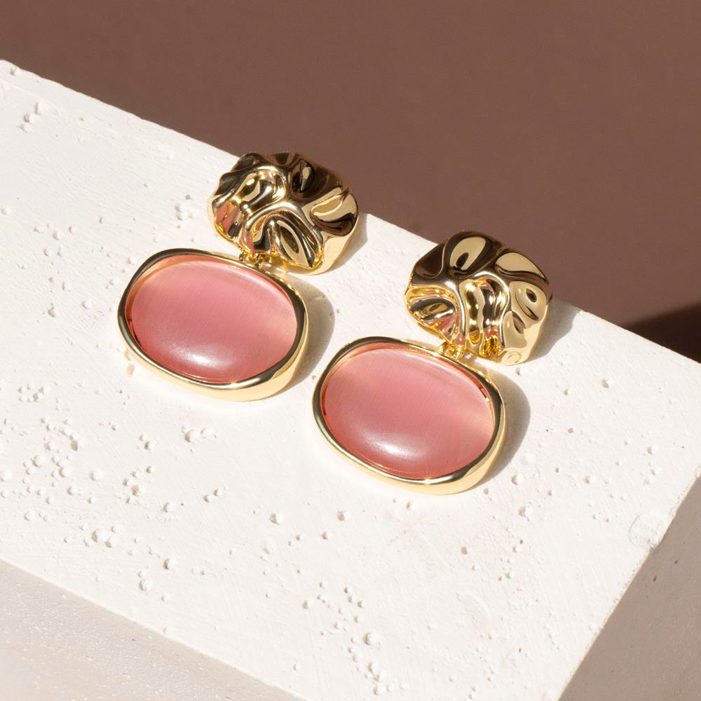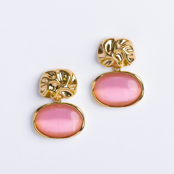 Molten Oval Pink Cat Eye Drop Earrings in Gold Plated Alloy