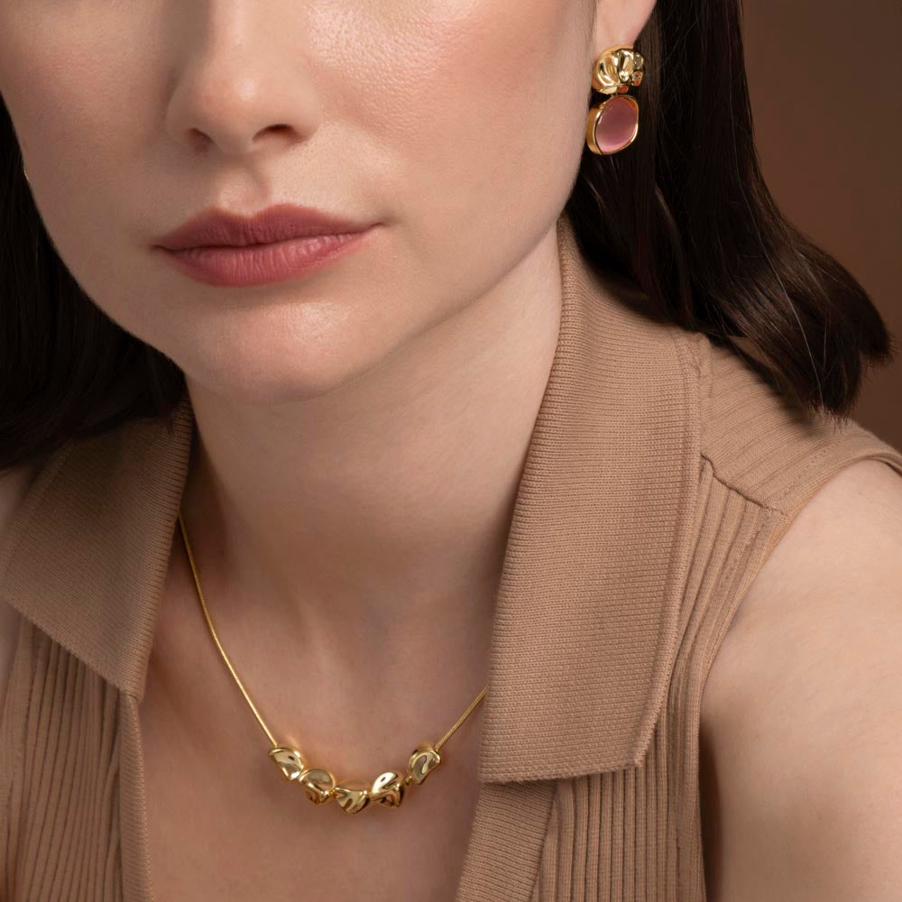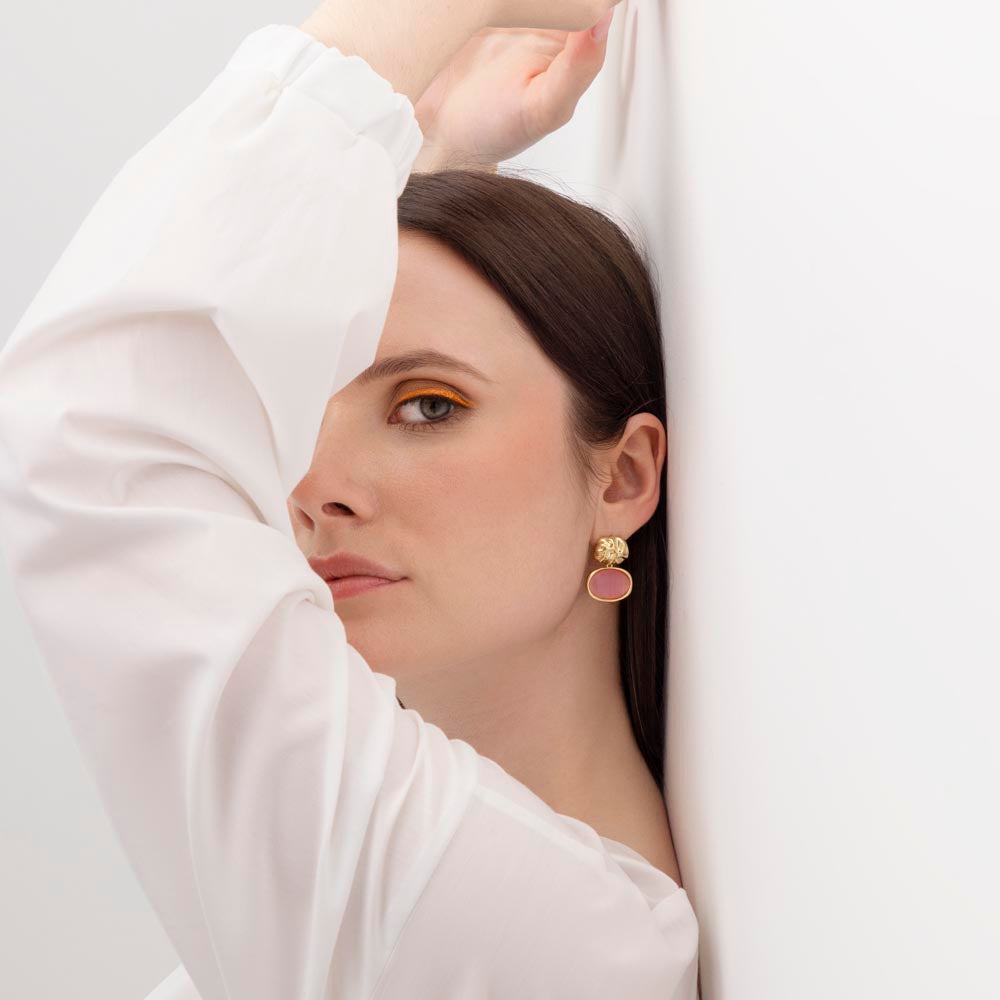 Feminine and delicate, these molten oval drop earrings showcase pink cat eye stone framed in fluid gold plated alloy. Soft and contemporary, these statement earrings add a pop of colour and refined glamour to any jewellery collection.