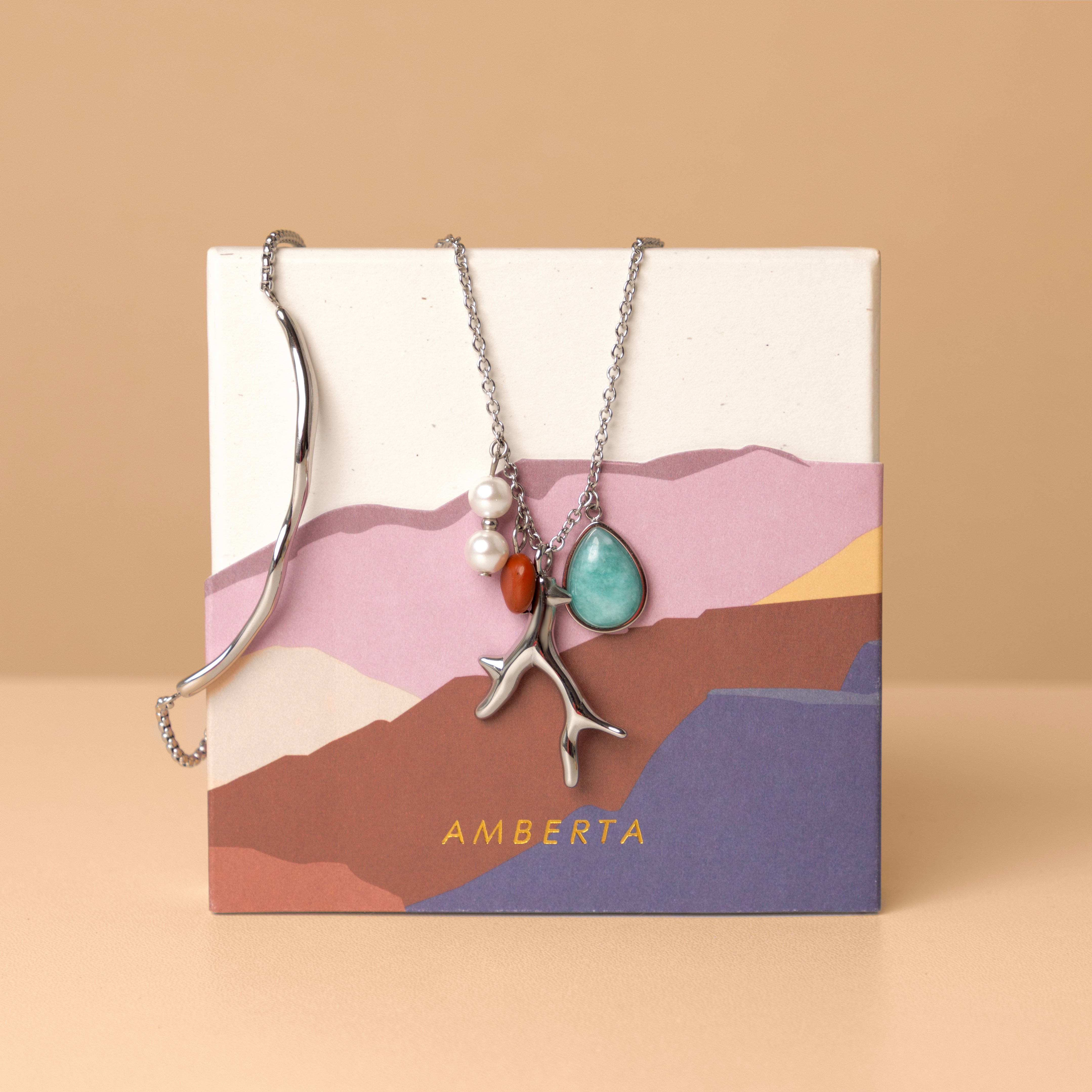 Beautiful necklace and bracelet set. I chose the silver version which suits my summer wardrobe perfectly. Loved the packaging, artwork and the soap as a gift which reflects its Scottish roots.