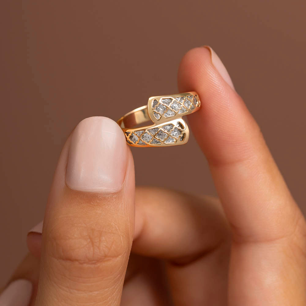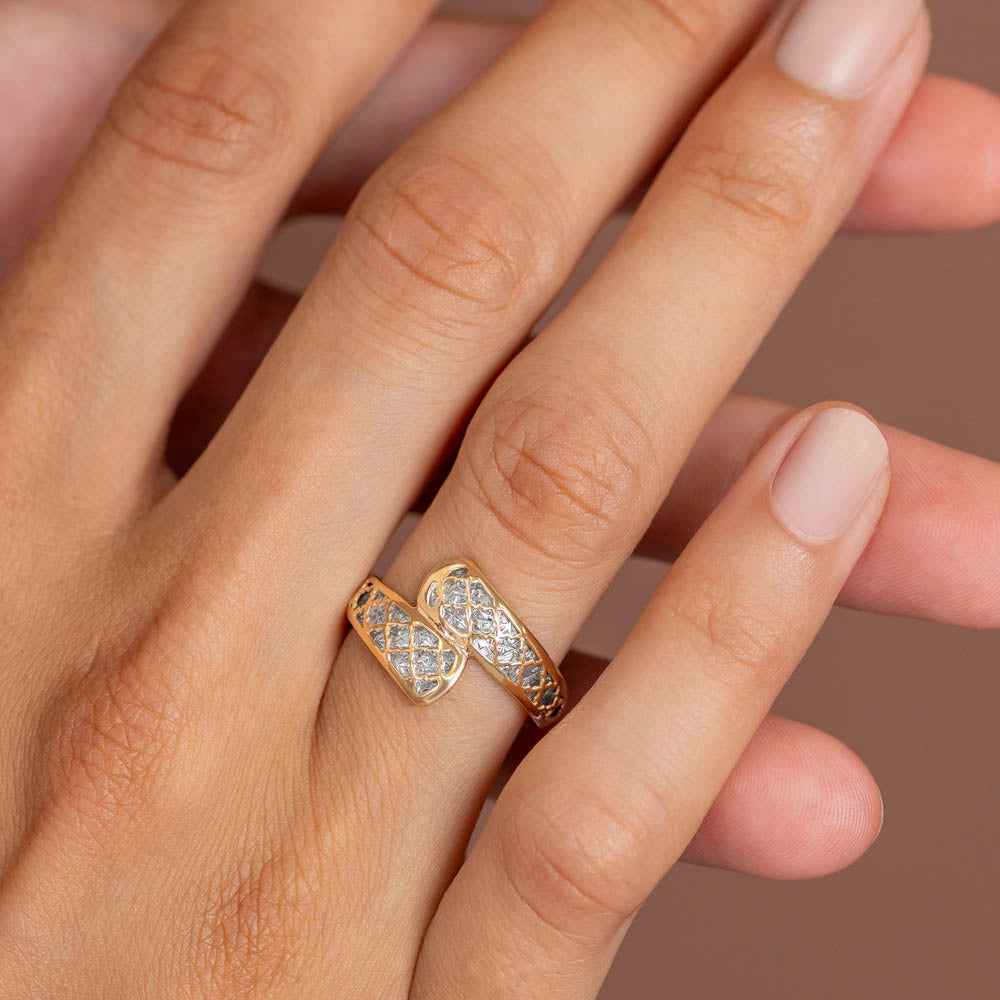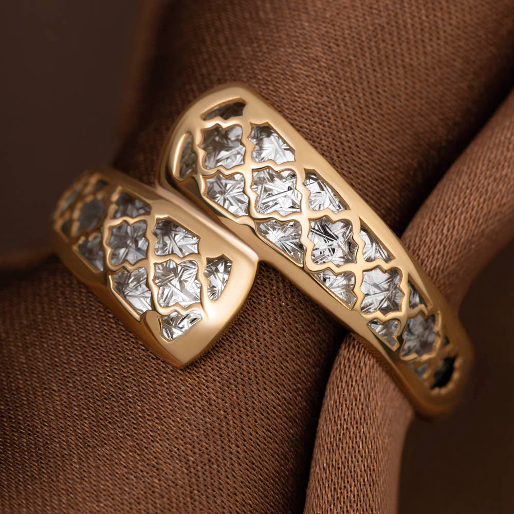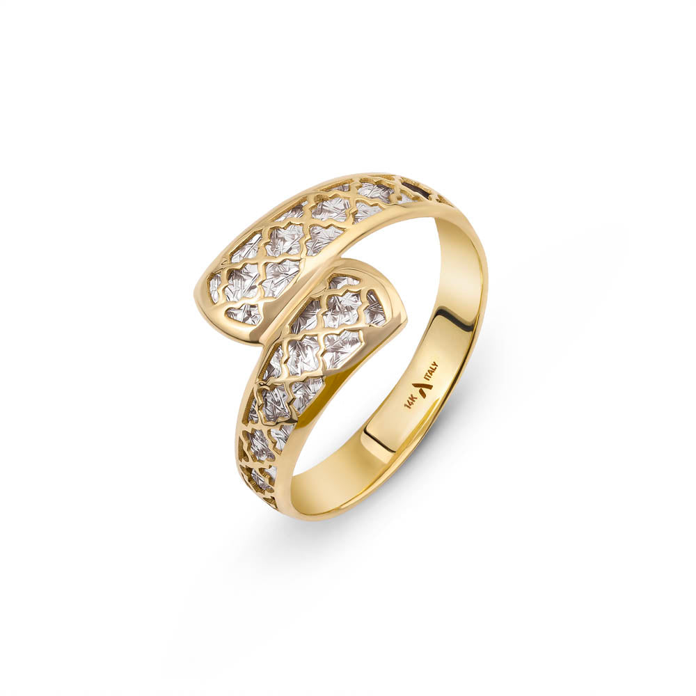 Elevate your style with our handmade gold wrap ring. This 14ct gold wrap ring features a sleek yellow gold base that elegantly layers over an intricate white gold filigree pattern, creating an illusion of embedded stones. The gold wrapped ring elegantly wraps around the finger, creating a fluid silhouette that catches the light from every angle. With their dazzling contrast and intricate flower design, our 14ct wrap rings are a standout addition to any jewellery collection.